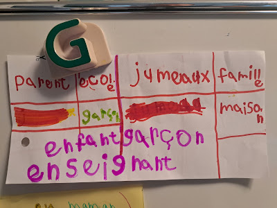 Marie a ramené un papier où elle a retranscrit des mots écrits au tableau par sa professeur. On se rappelle qu'elle ne lit pas encore, qiand même. Je trouve donc que le tracé de ses lettre est vraiment bien pour une enfant de 5 ans, particulièrement ses c cédille, qui sont déjà plus beaux que les miens!